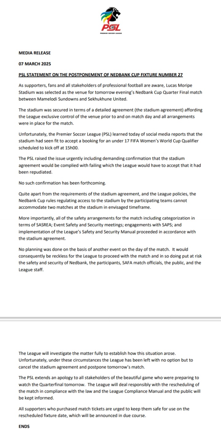 Premier Soccer League(PSL) postpones Mamelodi Sundowns versus Sekhukhune United Nedbank Cup quarterfinal clash due to stadium being double booked.